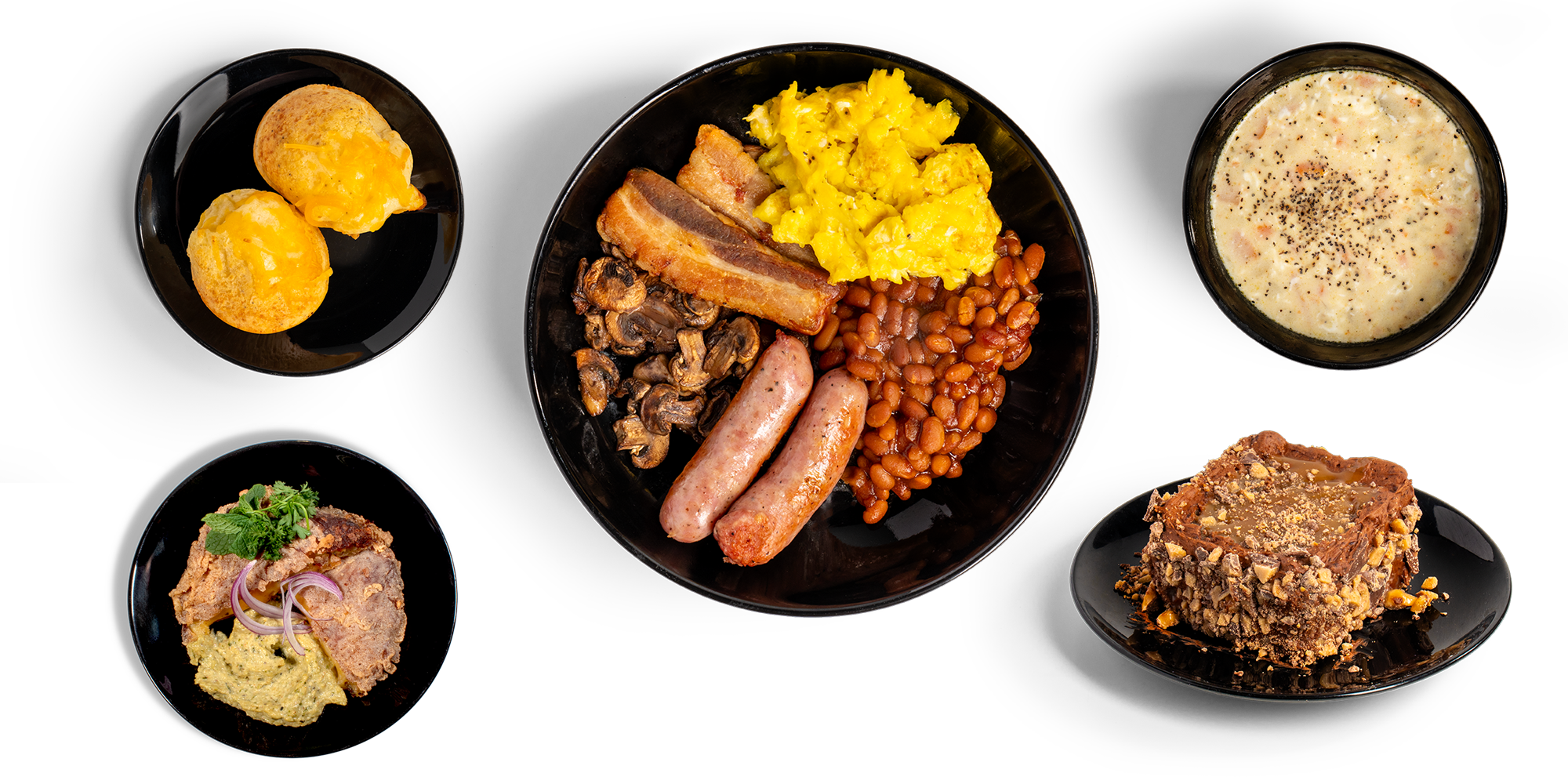 A Ghibli-inspired take on the legendary breakfast scene: a hearty plate of ham cutlet, butcher’s sausage link, soft scrambled eggs, sautéed mushrooms, baked beans, and rustic toasted bread — bold, comforting, and definitely enough to wake Howl.